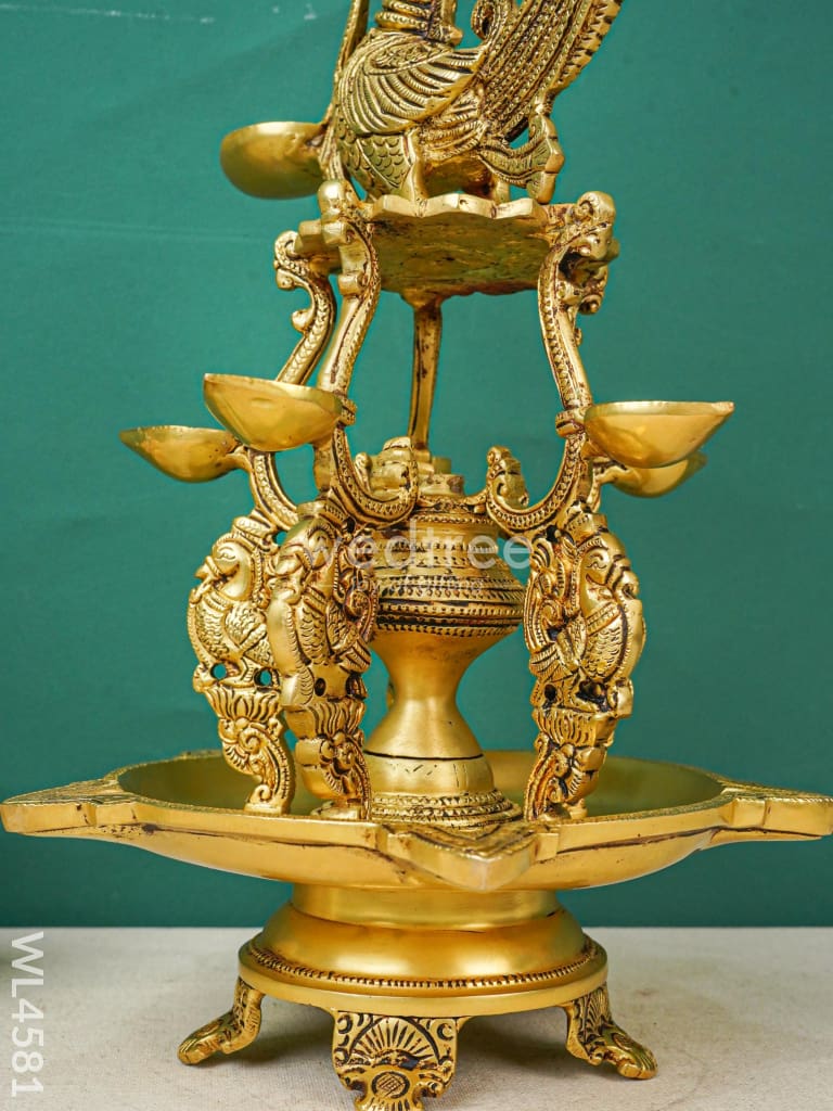 - This beautiful diya comes in black antique finish and has a beautiful Annapakshi on the top carved to perfection.