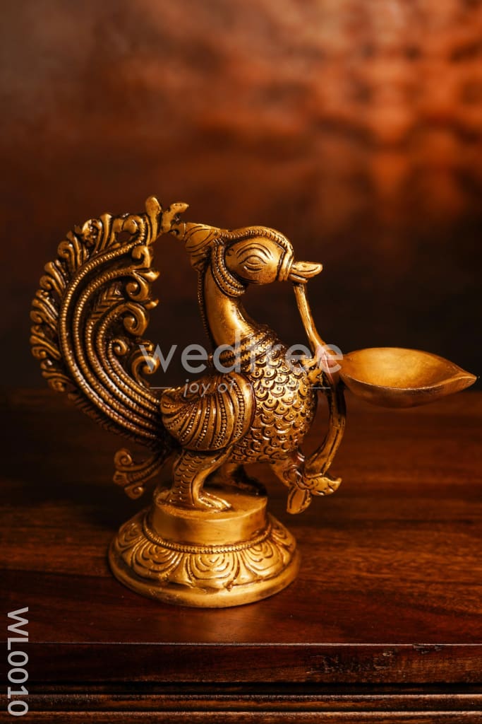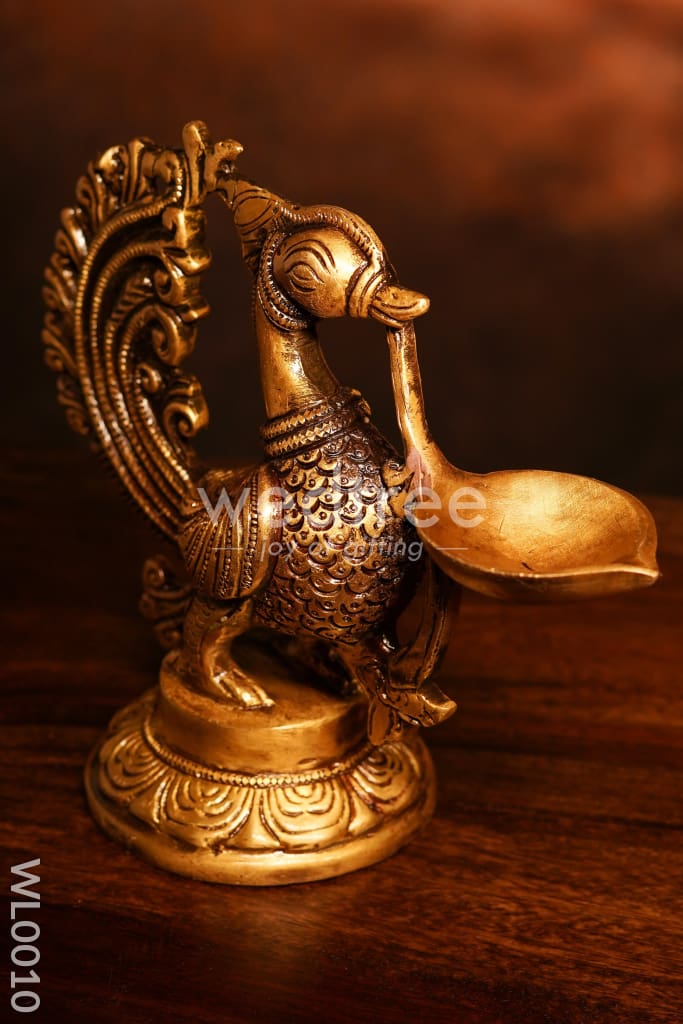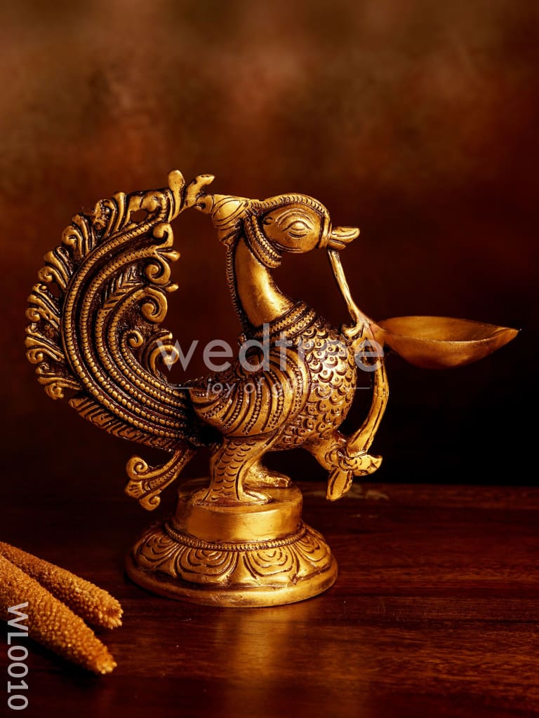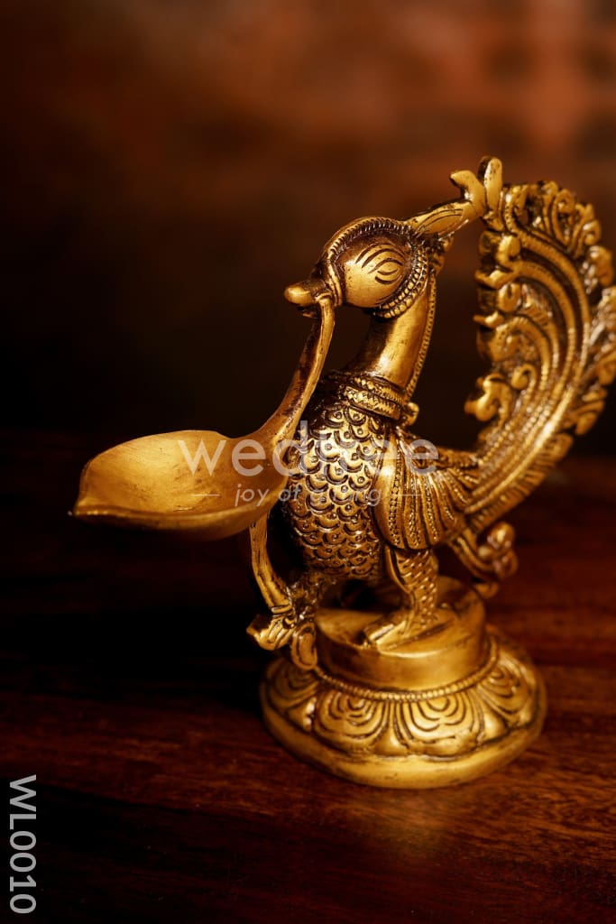 - Here is a beautifully carved Annapakshi with a single face Diya attached.