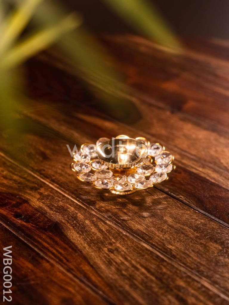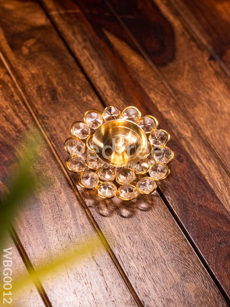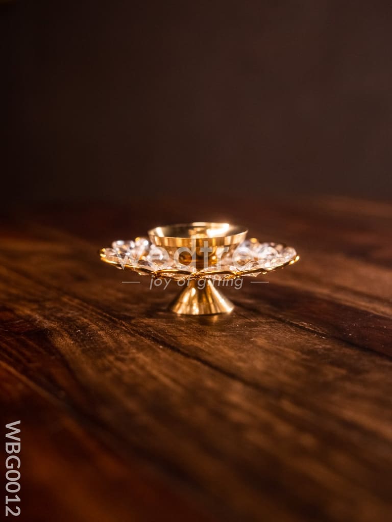 Check out this pretty flower shaped Diya completely made of brass. The Diya comes with a lovely stand. The flower shape is so pretty with sharp edges and a gleaming finish. It is surrounded by round crystal arrangements which will brighten the whole space with its reflection!