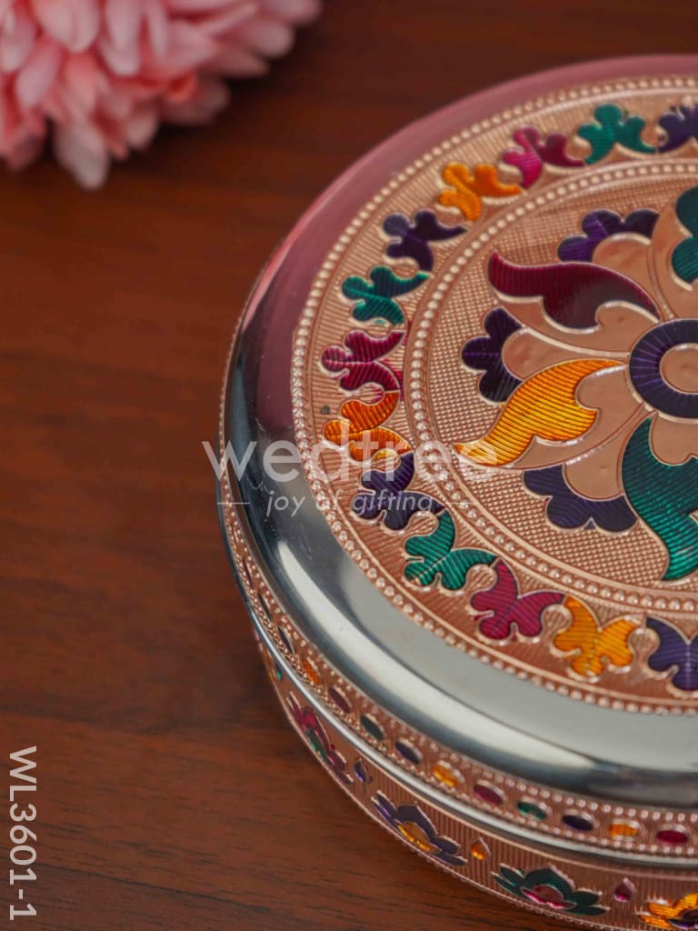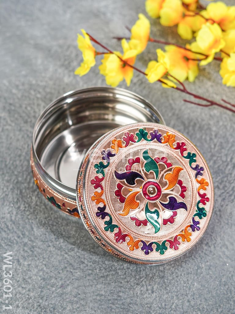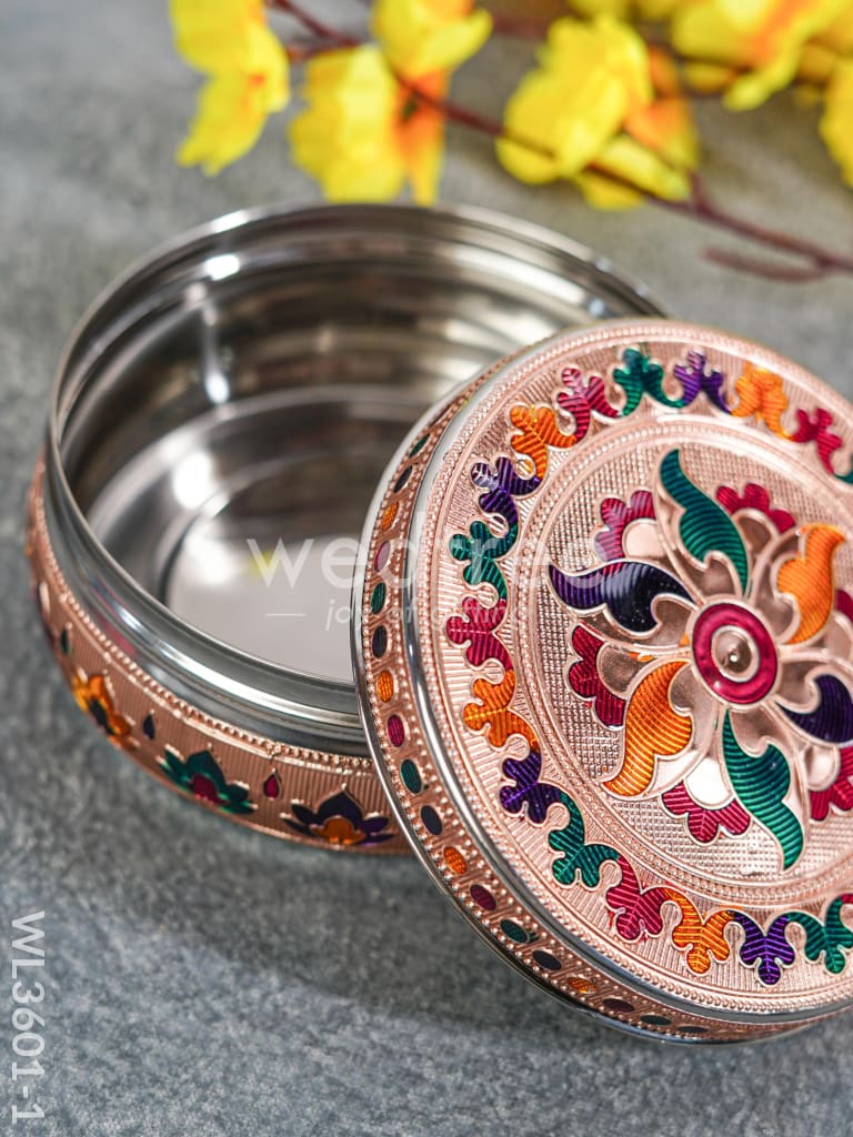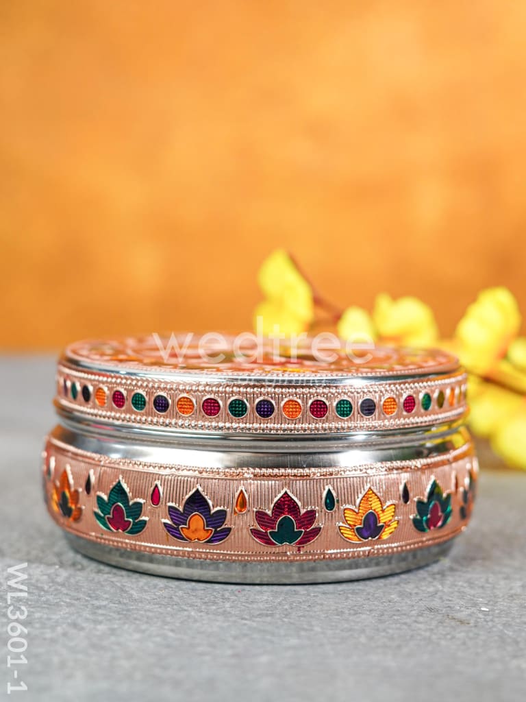 - Crafted with premium quality stainless steel and covered with beautiful Meenakari artwork in a classic copper finish, it’s both a practical choice for everyday use.