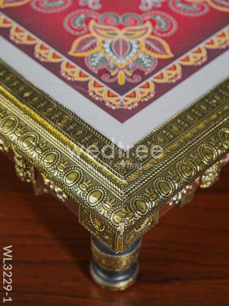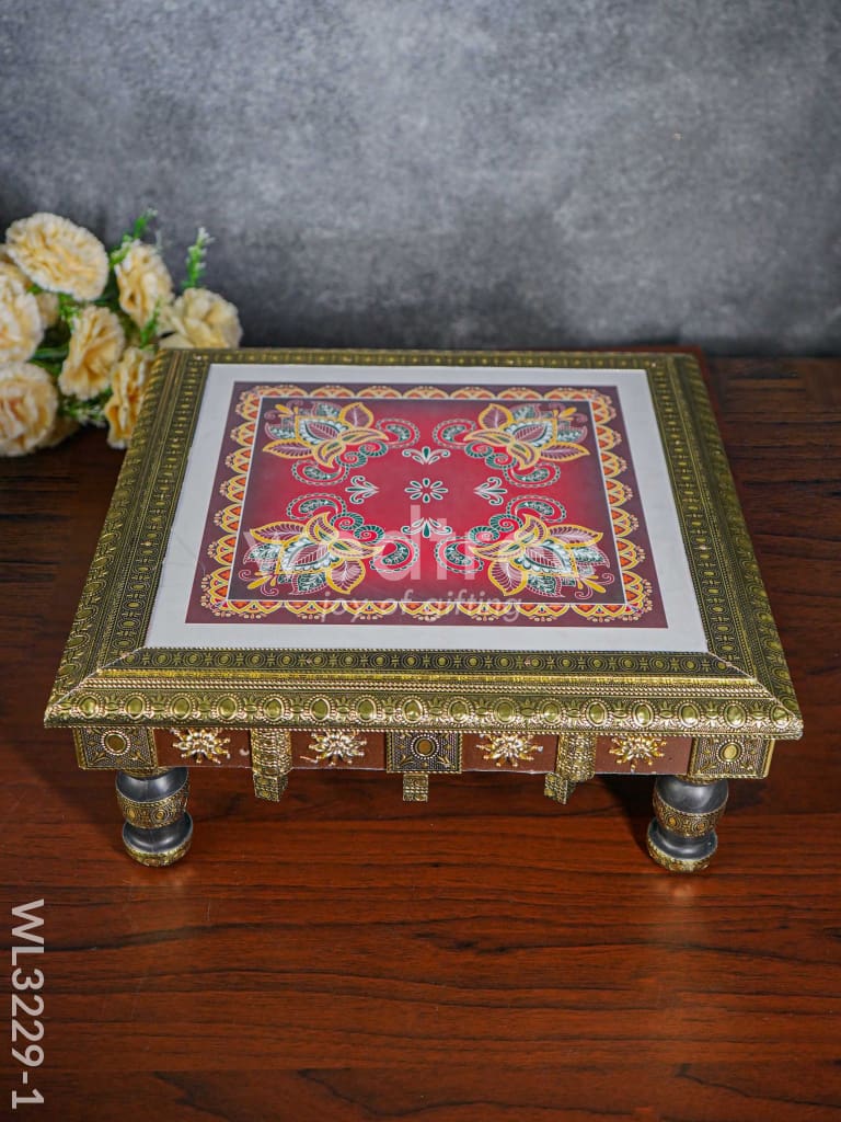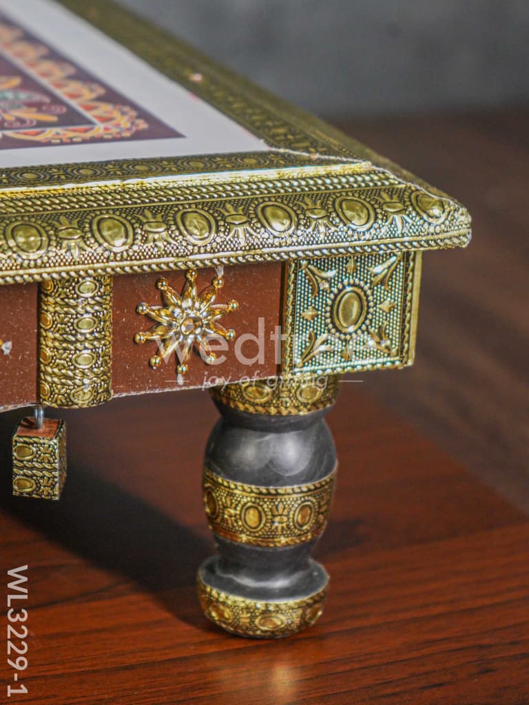 - This manai is fitted with intricately designed golden oxidized sheet, giving it a festive appeal.
