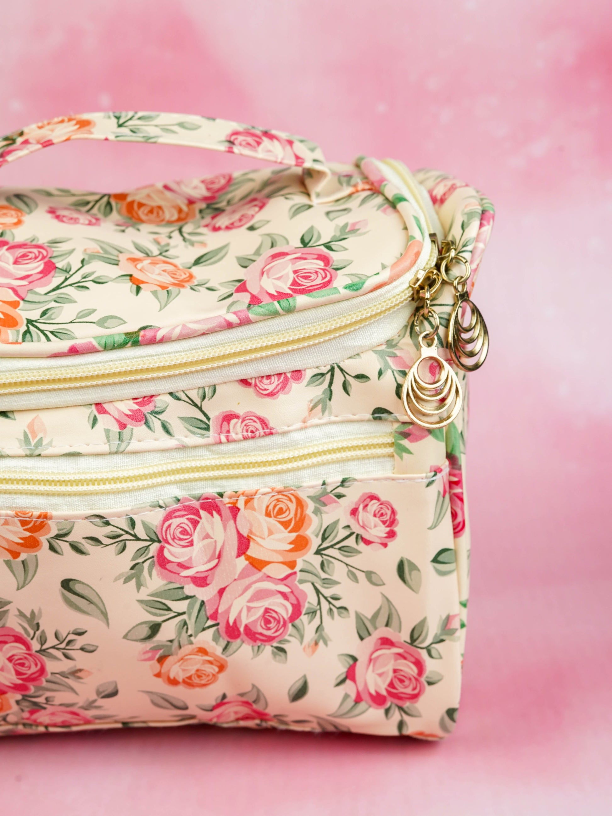 - This Bag Features with a Vibrant Floral Print made up of Pink, Peach, and Coral Roses with Green Leaves.