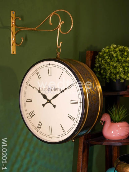 Here the railway clock is double sided with one side in Numeric time and the other side in roman time. This railway clock is copper coated in which floral design is printed. It adds elegance to the entire piece. The clock also comes with a stand for hanging.