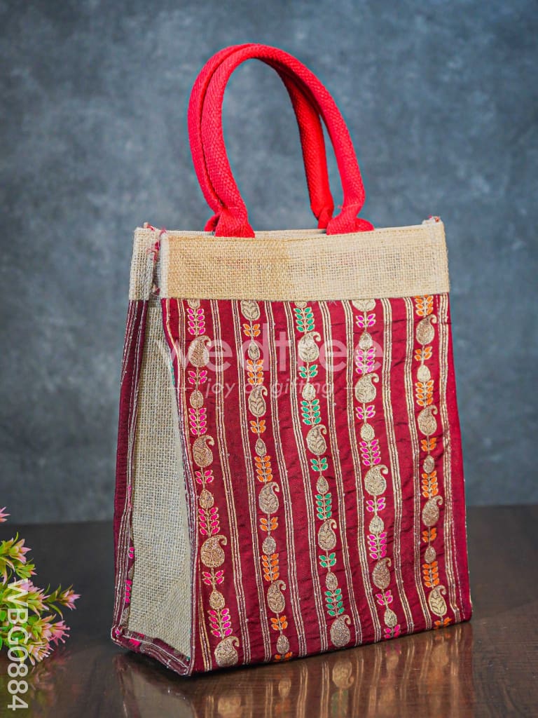 - Here is a designer jute bag with raw silk fabric.