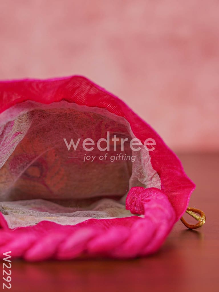 - An eye-catching potli bag with peacock feather designs embroidered on raw silk fabric.